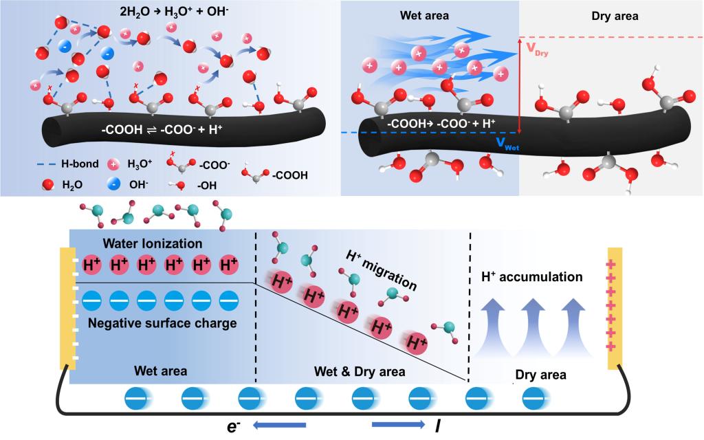 蒸发诱导水伏发电的离子和电荷迁移示意图