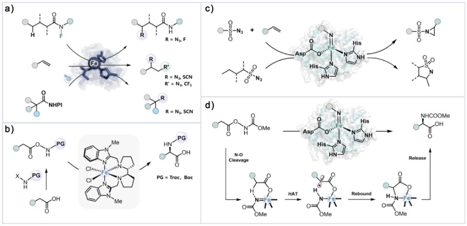酶在漫长的自然进化中形成了高度专一的催化功能,但也隐藏着催化混杂性,在特定条件下能够催化非天然反应。非血红素铁酶在催化非天然反应中已经展现出巨大潜力,包括碳氢叠氮化、碳氢氟化、双健双官能团化、Diels─Alder环加成,Michael加成等多种非天然反应。