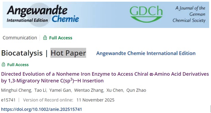 近期,我校生物工程学院赵群教授团队成功将非天然的氮宾迁移反应机制引入金属酶催化体系,实现了酶促法合成手性非天然氨基酸,研究成果以“Directed Evolution of a Nonheme Iron Enzyme to Access Chiral α-Amino Acid Derivatives by 1,3-Migratory Nitrene C(sp3)─H Insertion”为题正式发表于Angewandte Chemie International Edition,该工作入选Angewandte当期的 “Hot Paper”。