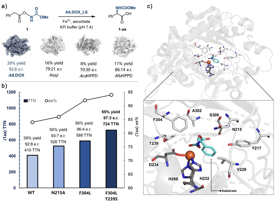 通过分子对接等手段,研究人员确定了在底物结合口袋的多个结合位点进行突变,最终发现突变体(AtLDOX_FL)对反应表现出优异的催化活性和立体选择性。工程化改造后的LDOX不仅能够适用于催化多种取代基的芳香族底物(卤素/甲氧基/甲基等取代基),还能够适配如噻吩等杂环体系,这些底物均能以较高收率和对映体选择性转化为相应的手性α-氨基酸衍生物,产率高达81%,TTN高达808,对映体选择性高达98/2。本研究利用定向进化策略改造非血红素铁酶,实现了立体选择性控制的1,3-氮宾迁移反应,为手性非天然α-氨基酸衍生物的合成提供了新的酶催化途径。