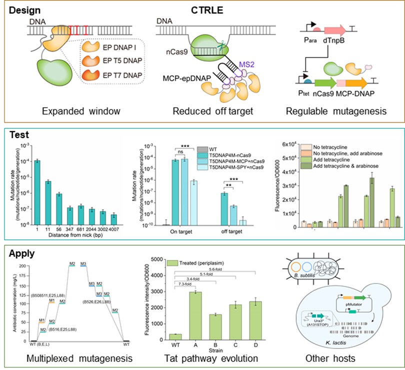 针对上述问题,研究团队基于高扩增性能的噬菌体DNA聚合酶与CRISPR-nCas9建立了高效可控的基因组靶向体内连续进化系统(CTRLE),并将其应用于基因组位点的连续进化以获得具有特定表型的菌株。研究人员首先基于DNA切口酶引导易错DNA聚合酶靶向突变机制,将高持续合成能力的噬菌体T5或T7 DNA聚合酶与nCas9蛋白融合,建立了具有宽诱变窗口(2kb)、全部12种碱基突变类型的体内靶向突变系统。其次,为优化系统性能,采用MS2-MCP蛋白招募策略取代传统融合表达,在维持高突变率的同时,脱靶率可降低54.8%-96.8%。同时,通过引入基于dTnpB的转录抑制系统,实现了对连续进化过程的调控。为验证该系统的多位点进化效率,研究人员利用CTRLE分别连续进化大肠杆菌基因组中与耐药性相关的三个基因和双精氨酸蛋白转运途径,短期内成功获得了具有三种抗生素抗性的进化菌株和周质蛋白转运效率提升超3倍的突变体。最后,研究人员进一步将CTRLE成功应用于革兰氏阳性菌枯草芽孢杆菌和真核微生物乳酸克鲁维酵母,靶向突变率可提升105倍-107倍。本研究构建的宽窗口、低脱靶、多位点、可调控的微生物体内连续进化系统为工业酶与微生物细胞工厂改造提供了高效工具平台(图1)。