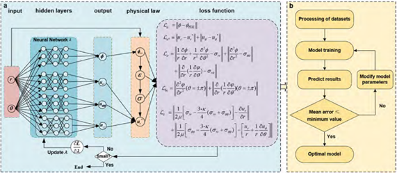 推理智能方面,课题组提出基于物理信息神经网络(PINN)的线性弹性断裂力学分析框架,首次实现了从稀疏位移数据中精准推断裂纹尖端关键力学参数。该技术将 Airy 应力函数与断裂力学公式融入神经网络训练,无需复杂有限元迭代即可求解应力强度因子(SIF)与横向应力(T-stress),为结构健康监测(SHM)提供了全新思路。该模型可广泛应用于航空航天、桥梁建筑等关键结构的裂纹增长预测与安全评估。