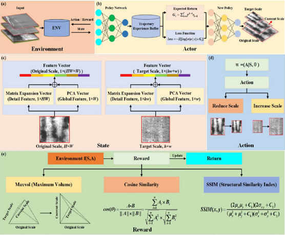 在感知智能层面,受多尺度力学理论启发,课题组构建了一个工业感知智能体的初级形态。展示了机器如何像人一样“学会去看”,并在此基础上做出智能决策,为最终实现具备环境感知、自主分析与实时决策能力的下一代工业智能系统奠定了坚实的基础。针对增材制造与传统金属加工中的表面缺陷检测难题,提出了基于强化学习的多尺度目标检测框架RLMS-YOLO。该技术突破了传统机器视觉被动、固定的感知模式,构建了一种具备自主感知与决策能力的工业感知智能体。能像人类专家一样主动“凝视”与“聚焦”,动态选择最能揭示缺陷本质的特征尺度。