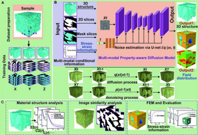 生成智能领域,课题组相继研发了融合 U-net 多尺度特征的生成对抗网络模型与多模态属性感知扩散模型(MPaDiffusion),分别实现了从 2D 切片到 3D 微观结构的高精度重建和结构性能的按需设计。该技术支持通过 3D 打印直接实现生成结构的物理实体化,为材料逆向设计、性能预测提供了高效工具,助力缩短新材料研发周期。