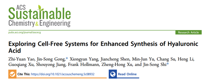 该论文以“Exploring cell-free system for enhanced synthesis of hyaluronic acid”为题在《ACS Sustainable Chemistry & Engineering》期刊上正式发表,江南大学2022级博士生姚志远为论文第一作者,史劲松教授、龚劲松教授为通讯作者,研究团队特别感谢荷兰代尔夫特理工大学Frank Hollmann教授、中南大学姜守勇教授、杨雄焱博士等的指导和帮助。研究工作得到国家自然科学基金、国家重点研发计划、泰山产业领军人才等项目资助。