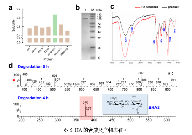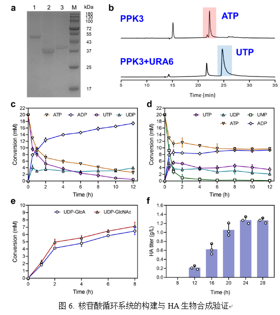 论文建立了一种无细胞级联催化系统,利用核苷酸补救途径,从廉价的单糖高效合成UDP-GlcA和UDP-GlcNAc,从而绕过了耗能的从头合成路线;并通过截短多杀巴斯德菌透明质酸合酶(PmHAS)的膜结合相关结构域,实现了其水溶性表达水平及顺序糖基转移酶活性。此外,还实施了ATP/UTP双再生策略以维持核苷酸供应。在优化条件下,该系统在24小时内可合成1.28 g/L的HA,其分子量范围为1.28×10⁴-1.02×10⁶ Da,底物转化率达到65.9%。这项工作不仅为规模化HA合成提供了一个经济平台,也为复杂生物聚合物建立了一个模块化的酶促工程化生产示范,在合成糖生物学领域展示了广泛的应用潜力。