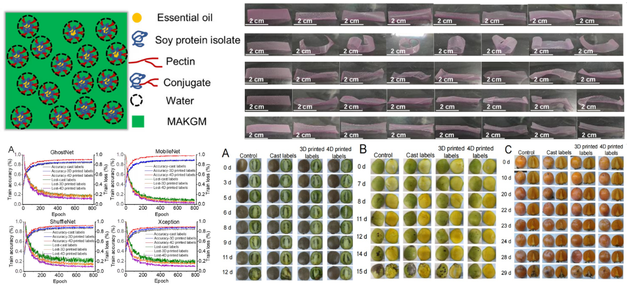 团队进一步开发出湿度/二氧化碳双响应4D打印变形标签。该标签在水果储运过程中,可同时响应包装内湿度上升引发的形状变化以及二氧化碳积累导致的pH下降驱动的颜色变化。通过集成轻量化深度学习模型,对标签形变与颜色图像进行自动识别,实现了对猕猴桃、青芒果、柿子等呼吸跃变型水果新鲜度等级的智能判别,模型准确率高达97%。