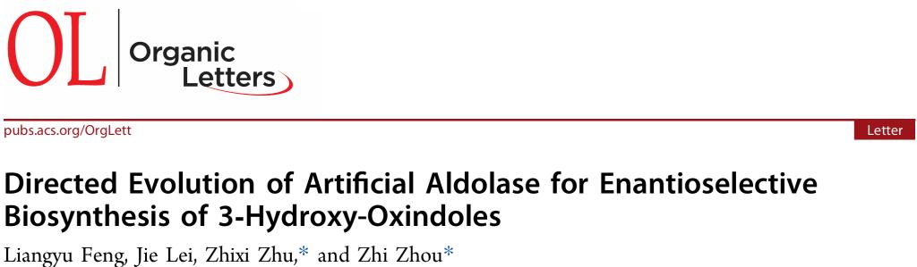 近日,江南大学周志教授课题组在中国科学院一区期刊Organic Letters上发表了题为“Directed Evolution of Artificial Aldolase for Enantioselective Biosynthesis of 3‑Hydroxy-Oxindoles”的研究论文。研究人员在肌红蛋白骨架(Myoglobin)中位点特异性地引入人工仲胺辅因子构建人工醛缩酶。该人工酶能够高效催化吲哚醌与活化酮之间的C−C键合成,经定向进化,工程化的人工醛缩酶制备获得的手性3-羟基氧化吲哚类化合物具有优异的对映选择性(最高可达96:4 er)和反应活性(最高可达99%产率)。该人工酶将化学小分子催化剂的非天然催化活性与蛋白骨架的可调性相结合,从而使得高效获取具有药用价值的手性吲哚醌成为可能。
