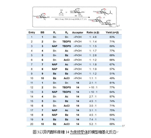 近日,江南大学朱蕴韬教授课题组在中国科学院一区期刊Chinese Journal of Chemistry上发表了题为“Synthesis of Heparan Sulfate Backbone Oligosaccharides by Directly Installing cis-Linkages on Solid-Phase”的研究工作。本研究成功制备了一个包含九种硫酸乙酰肝素骨架寡糖的化合物库,其中GlcN、GlcA和IdoA之间的顺式糖苷键均在固相中构建 (图2)。 作者首先在液相中对十种具有不同C3-OH和C6-OH保护基组合的2-叠氮-2-脱氧硫代吡喃葡萄糖苷进行了糖基化条件探索。该研究发现,C6-OH位含有TBDPS保护基的硫代吡喃葡萄糖苷在构建GlcN与GlcA/ IdoA之间的α-1,4糖苷键时为最适供体。此外,根据团队先前的研究,在具有C2-OBn的葡萄糖硫苷进行糖基化时,3,6-位酯化可显著促进顺式选择性 (J. Am. Chem. Soc. 2021, 143, 9758–9768)。本研究中砌块9和10 (图3) 的结果进一步证实了这一结论。