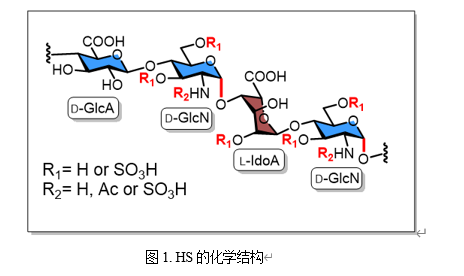 硫酸乙酰肝素 (Heparan sulfate, HS) 是糖胺聚糖 (Glycosaminoglycan, GAG) 家族中的重要成员,广泛存在于细胞表面及细胞外基质中。 HS在高尔基体中经糖基转移酶催化合成,其结构由D-葡萄糖胺 (GlcN) 与D-葡萄糖醛酸 (GlcA)[GlcN-α-1,4-GlcA-β-1,4-]或D-葡萄糖胺与L-艾杜糖醛酸 (IdoA)[GlcN-α-1,4-IdoA-α-1,4-]组成的二糖重复单元构成。该骨架在糖醛酸的C2-OH位,以及葡萄糖胺的C6-OH、C3-OH和C2-NH₂位具有多个硫酸化位点 (图1)。这种广泛的硫酸化修饰使HS带有高负电荷,赋予其独特的蛋白质-聚糖相互作用特性,并介导多种生物学功能,然而,该聚糖结构高度复杂且具有显著异质性,这为获取精确结构的该样品并用于后续生物活性的研究带来了巨大的挑战。目前,HS在液相中的化学合成已得到较好发展,并在构建HS化合物库方面取得了许多重要成果。尽管如此,该领域的深入发展仍需在糖化学专业知识的支撑下开展,并投入持续而系统的研究努力。