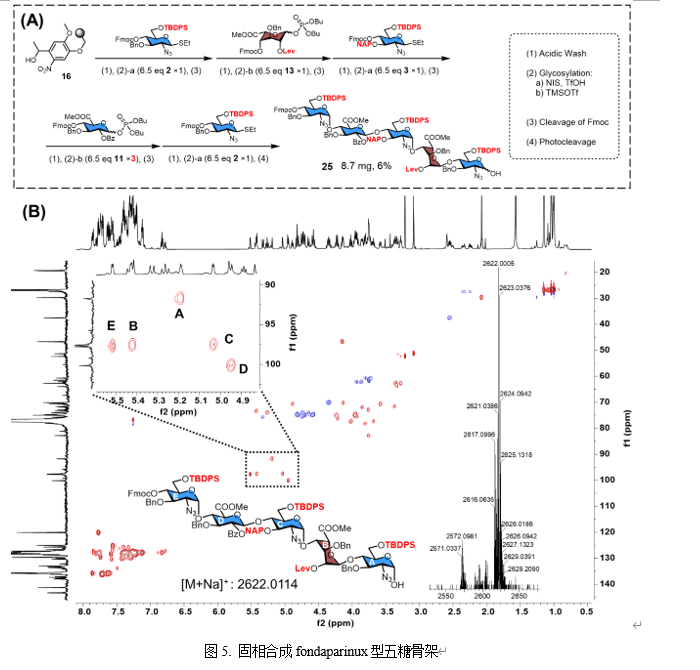 在固相构建HS寡糖骨架初期,作者测试了带有碱敏感连接子的Merrifield树脂 (Chem. Eur. J. 2025, 31, e202500603),但由于碱切过程不仅会切断寡糖与树脂的连接并脱除Bz保护基,还会同时裂解TBDPS保护基并部分水解羧酸甲酯,导致其不适用于在潜在硫酸化位点引入正交保护基,因此该方案被放弃。作者最终选用含有光裂解连接子的固相载体进行后续研究,并在固相上成功合成了四个由GlcN-GlcA或GlcN-IdoA交替重复组成的二糖和四个四糖(图4)。最后,作者合成了一种包含GlcN、GlcA和IdoA结构单元的fondaparinux型五糖 (图5)。所有潜在硫酸化位点均通过正交保护策略实现,获得了可接受的产率与优异的α-立体选择性,首次在固相上实现同时含有GlcN、GlcA和IdoA结构单元的完整HS骨架寡糖合成。该策略无需借助预制二糖砌块,而是在固相体系中原位构建了具有合成挑战性的顺式糖苷键,为复杂肝素寡糖化合物库的自动化构建提供了研究基础与有价值参考。