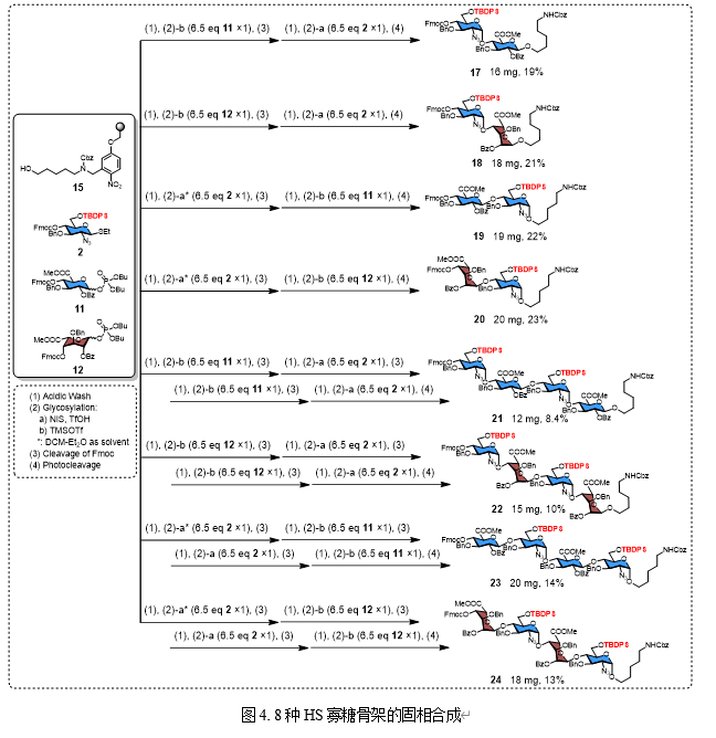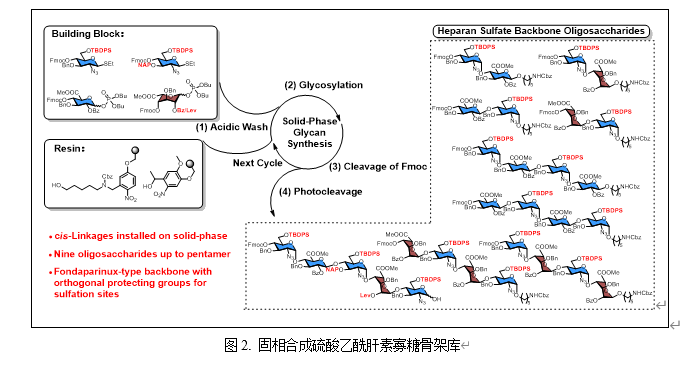 固相聚糖合成(Solid-phase glycan synthesis, SPGS)是制备结构明确聚糖的一种高效技术,它能显著简化聚糖组装过程中间产物的纯化步骤。自2001年实现自动化聚糖组装(Automated Glycan Assembly, AGA) 以来 (Science 2001, 291, 1523-1527),过去二十年间已有多种具有不同生物学功能的聚糖通过该方法成功制备,包括具有反式糖苷键连接的糖胺聚糖,如硫酸软骨素、硫酸皮肤素和硫酸角质素。然而,在固相上构建含多个顺式糖苷键的聚糖仍是一项具有挑战性的工作,因为在链延伸过程中无法分离立体异构体。目前仅有少数关于固相组装含多个顺式糖苷键聚糖的报道。对于HS,由于葡萄糖胺和糖醛酸结构单元的反应活性较低,其固相合成面临更大挑战,需要同时解决反应活性与立体选择性问题。