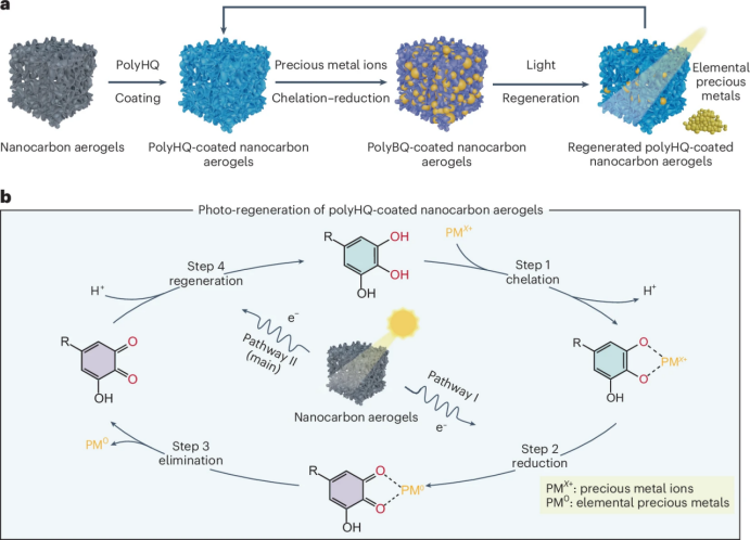 针对上述挑战,江南大学刘天西教授、林歆怡教授团队创新性地提出一种光化学再生策略,通过将酚-醌氧化还原循环整合到纳米碳气凝胶上,实现了活性吸附位点的再生以及对多种贵金属的反复捕获与释放,为金属回收提供了一条实用且可持续的途径。具体而言,本研究在具有光电效应的纳米碳气凝胶骨架上构建了多酚界面复合层,酚羟基通过配位作用吸附贵金属离子并向其提供电子,将其还原为金属单质,同时酚羟基自身被氧化为醌式结构。光照条件下,纳米碳气凝胶产生的光生电子迁移至界面并将醌式结构原位还原为酚羟基,从而实现吸附位点的再生。得益于该光化学再生策略,所制备的复合气凝胶性能获得了突破性提高:吸附容量高达15925.5 mg g-1,可稳定运行超过250 小时。与现有技术相比,其吸附容量提高了三倍以上,工作时长延长了十倍,同时减少了88.4%的电力和97.7%的试剂消耗。该再生策略同样适用于吸附回收Ag、Pt、Pd等其他贵金属,特别是在金属离子浓度仅为ppm至ppb级的真实溶液体系中(如CPU浸出液、矿石废水、天然海水)仍能实现接近100%的回收效率。