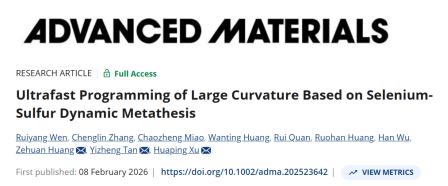 近日,化学与材料工程学院谭以正副教授联合清华大学许华平教授与北京大学黄泽寰教授,在含硒/硫动态材料的光致结构编程领域取得了重要研究进展,研究成果以“Ultrafast Programming of Large Curvature Based on Selenium-Sulfur Dynamic Metathesis”为题在线发表在《Advanced Materials》上,论文第一作者为江南大学博士研究生温瑞阳,化学与材料工程学院为第一研究单位。