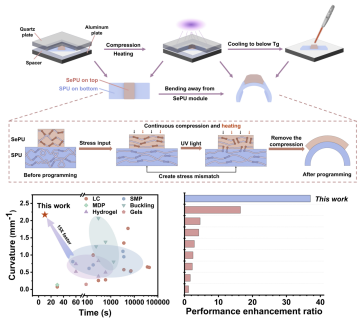 如何将二维材料转变为功能化的三维结构,是可编程材料领域的重要前沿问题。曲率作为二维材料的本征特性,直接影响结构的形态和功能。然而,实现“超快结构编程”与“超大曲率成形”的平衡依然是挑战所在,现有方法难以兼顾构建速度与曲率。此外,传统的拉伸、溶胀或复杂梯度设计常伴随全局应变,难以在局部区域形成足够大的应力错配,从而限制了曲率的快速形成与精确控制。因此,如何在简单且可扩展的工艺条件下实现超快结构编程并获得稳定的超大曲率,已成为该领域亟待解决的关键问题。