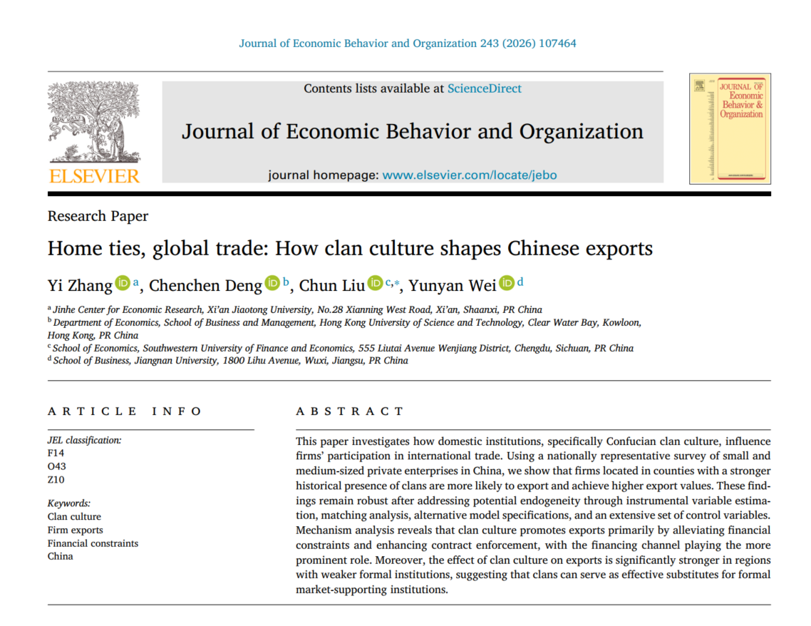 近日,商学院魏昀妍副教授与西安交通大学张一教授、香港科技大学博士生邓晨晨、西南财经大学柳春博士共同完成的论文“Home ties, global trade: How clan culture shapes Chinese exports”在《Journal of Economic Behavior & Organization》(JEBO)正式发表。JEBO在ABS管理学期刊中评定为3星,是行为经济学与制度经济学领域公认的国际权威期刊。本次论文发表实现了江南大学商学院在该期刊上的首次成果发表,标志着学院在行为经济学与国际贸易交叉研究领域取得了新的突破。