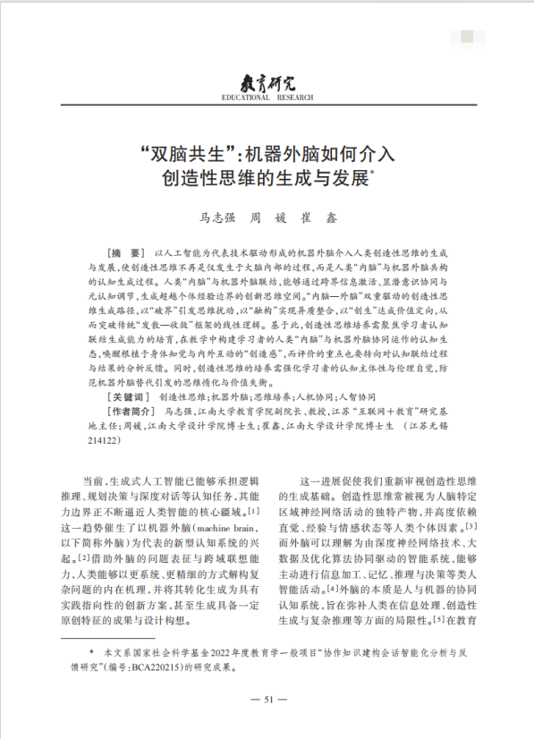 近日,人文学院马志强教授团队研究成果《“双脑共生”:机器外脑如何介入创造性思维的生成与发展》一文被我国教育学领域顶级期刊《教育研究》录用,论文刊载于该刊2026年第3期。