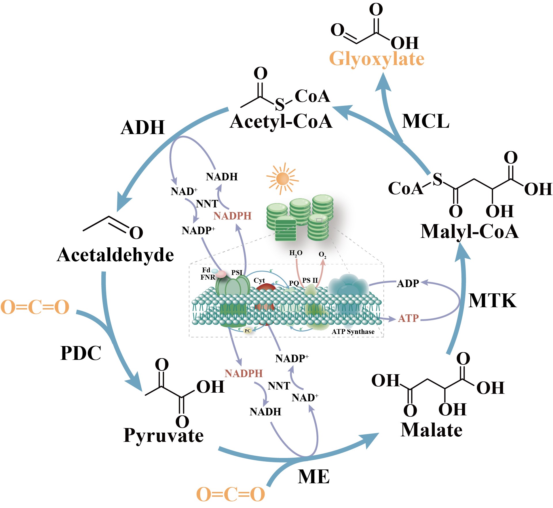 为应对CO2生物转化在实际应用中面临的挑战,陈修来教授团队构建了一种光驱动CO2固定生物系统(LCFB),该研究通过将一种全新的人工设计固碳途径——丙酮酸脱羧酶/苹果酸酶(PM)循环,与天然类囊体膜(TKs)相耦合,构建了集CO2固定、能量再生和还原力供给于一体的系统。首先,通过代谢逆合成的方法,构建了一条固定CO2合成乙醛酸的PM循环。通过路径关键酶的挖掘与筛选,结合路径模块化重构与优化,并利用13C同位素示踪技术证明了PM循环的有效性。其次,为满足PM循环对能量和还原力的需求,该研究利用菠菜的TKs构建了一种基于天然TKs的光驱动能量和还原力再生引擎,其中ATP和NADPH的再生速率分别为1.87和2.5 μmol L–1 min–1 μg–1 Chl。基于PM循环和菠菜TKs的可行性,组装构建了光驱动CO2固定合成乙醛酸的LCFB系统,CO2固定速率达到了2.37 nmol min–1 mg–1蛋白。最后,以“即插即用”的模块化策略,将LCFB系统分别与C2、C3和C4回补路径相结合,构建了光驱动的PM-C2、PM-C3和PM-C4路径,成功实现了利用CO2直接生物合成多样化的多碳化学品,包括:醇类、醛类、酸类以及氨类。
