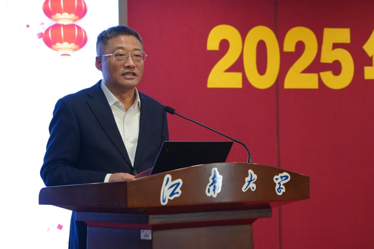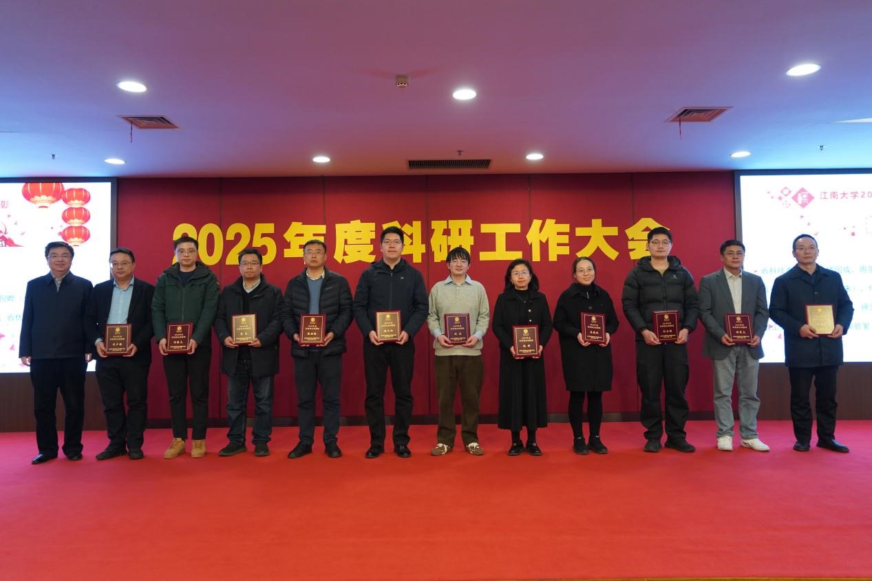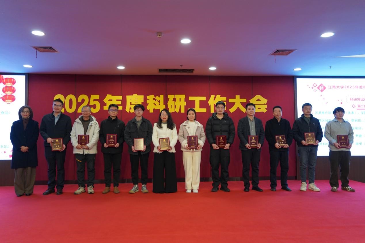 大会对2025年度为学校科研事业作出突出贡献的个人、团队和集体进行了集中表彰。陈卫、吴林海、匡华、王建华、王刚、陈松友、布伦诺·安德烈亚斯、董亮亮等八位教师荣获“科研杰出贡献奖”;59人次教师获得“科研突出贡献奖”;33个团队被授予“优秀团队奖”;食品学院、生物工程学院、医学院、化学与材料工程学院、商学院、马克思主义学院等6个学院荣获“有组织科研奖”。